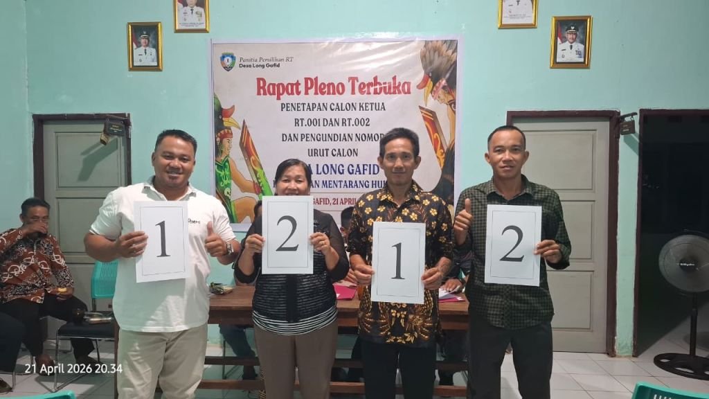 Panitia Pemilihan Ketua RT Desa Long Gafid telah melaksanakan rapat pleno penetapan bakal calon Ketua RT menjadi calon Ketua RT sekaligus pengundian nomor urut pada tanggal 21 April 2026. Kegiatan ini bertempat di Kantor Desa Long Gafid.